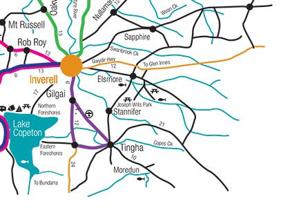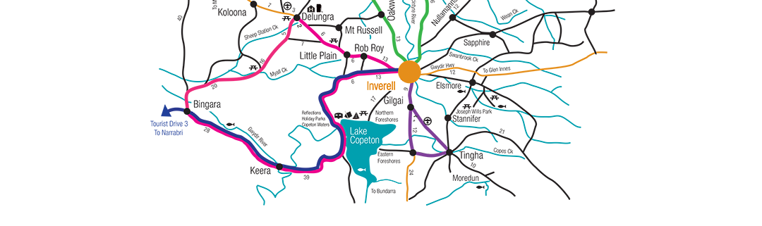 Inverell > Copeton Dam > Bingara > Delungra > Inverell > Total 155 km