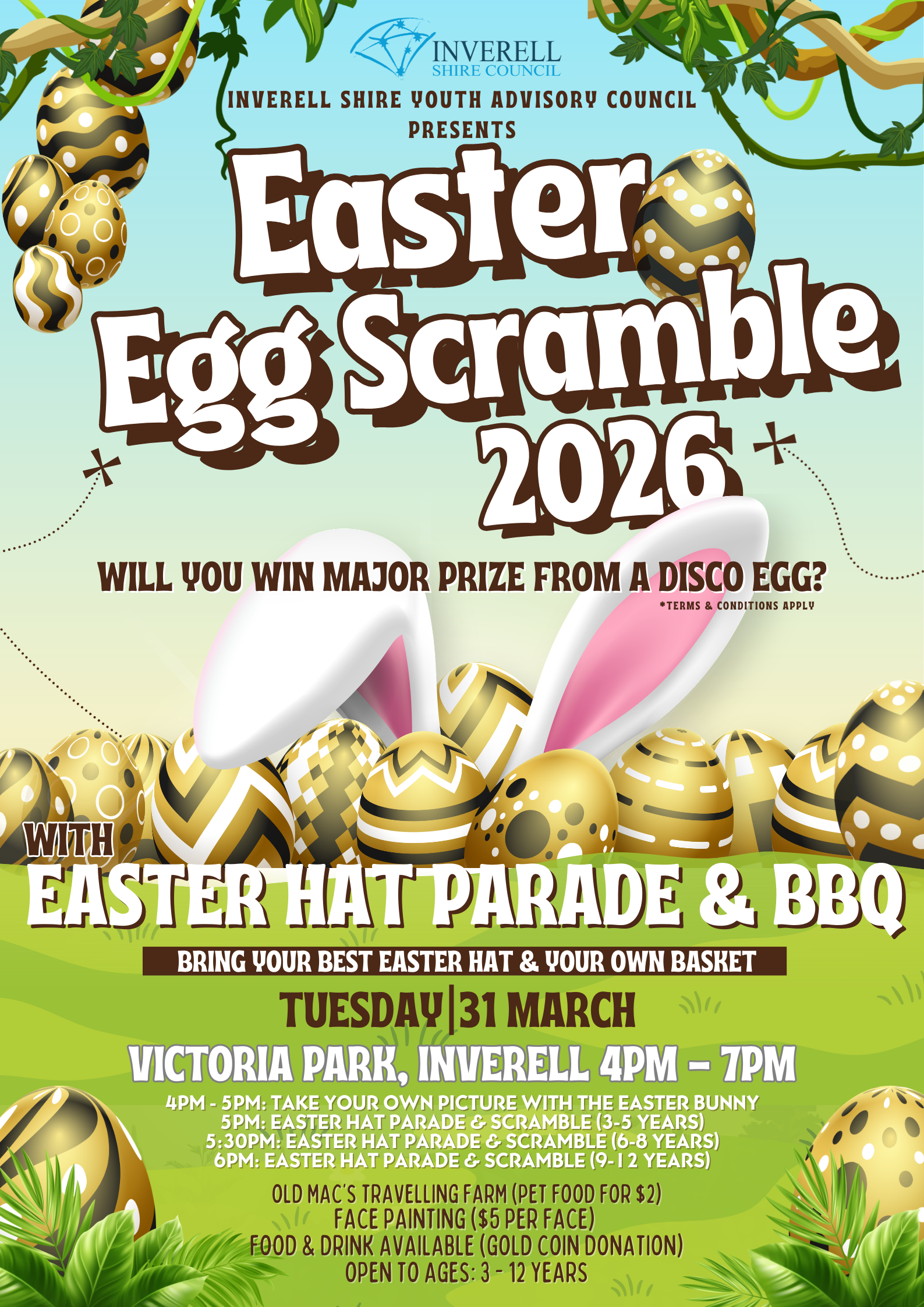 What a way to celebrate Easter! Inverell Shire Youth Advisory Council are hosting an Easter Egg Scramble. From 4pm on Tuesday 31st March in Victoria Park. There will be Easter Hat Parades, BBQ dinner, Face Painting, Old McDonalds Travelling Farm, Photo's with the Eater Bunny.| 4pm - 5pm: Take your own picture with the Easter