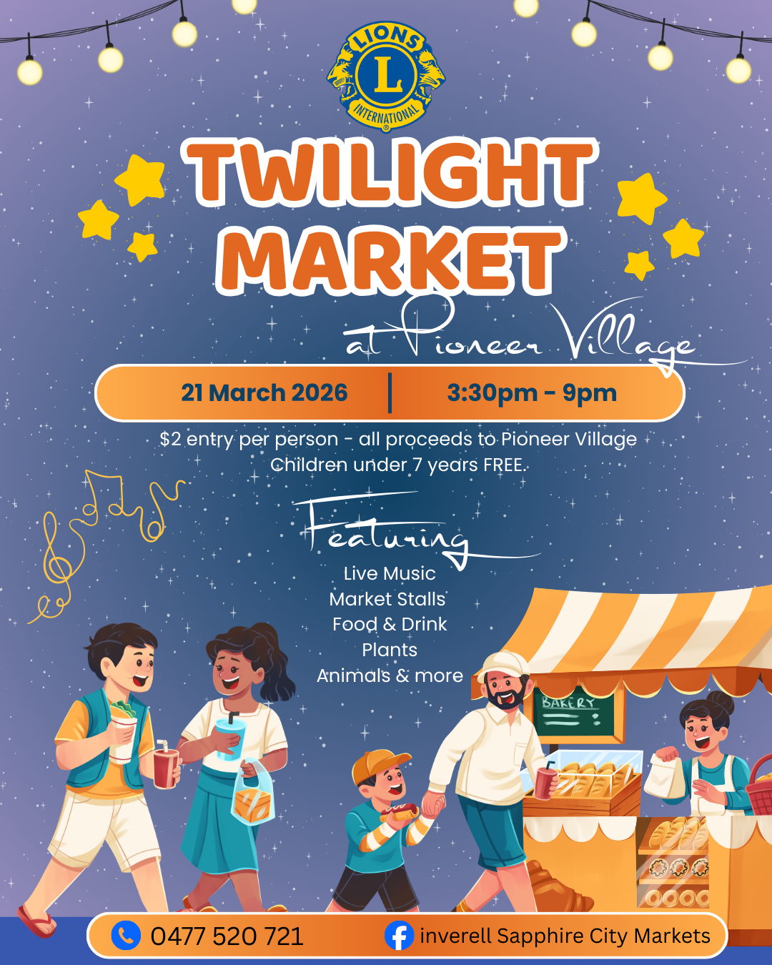 Join Inverell Lions as they host their first Twilight Market for 2026. Live Music Market Stalls Food & drink Plants Animals and more $2 entry per person, kids under 7 years are free. Saturday, 21 March 2026 from 3:30pm - 9:00pm Inverell Pioneer Village.