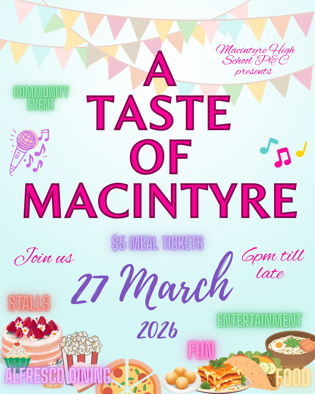 Macintyre High School P & C presents: Taste of Macintyre for 2026. Join them from 6pm on Friday, 27th March 2026 for a tastebud tantalising evening. Purchase your meal tickets and enjoy the variety of different food on offer. A night promised to be filled with: Fun Food Entertainment Stalls & Alfresco Dining